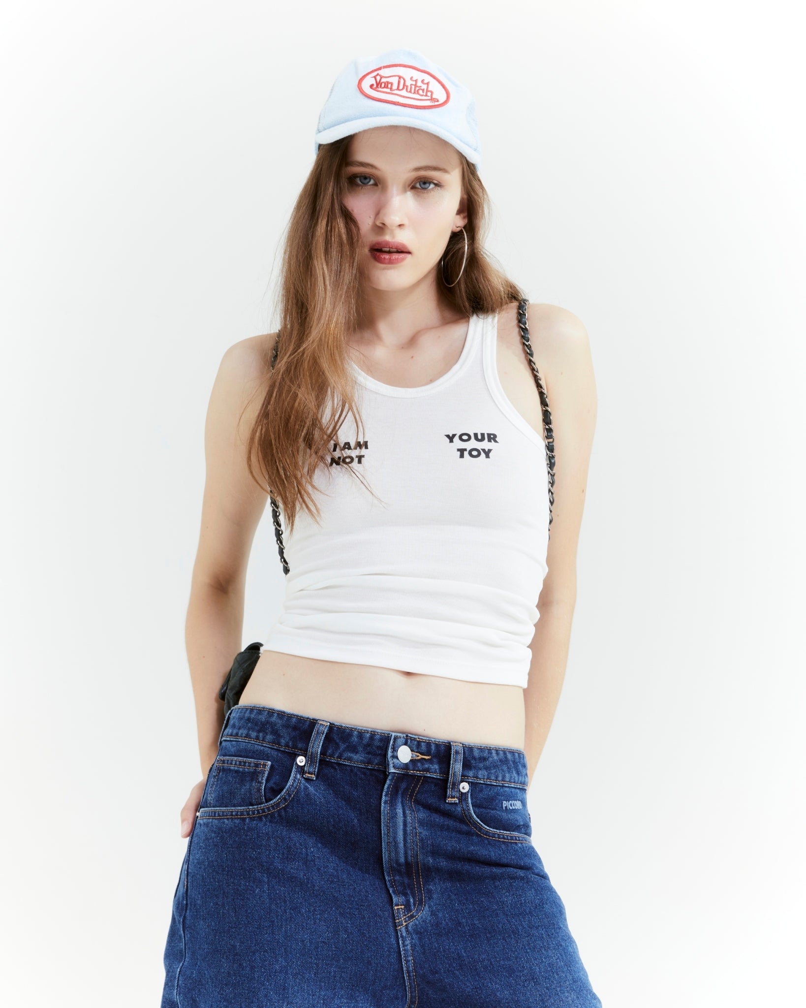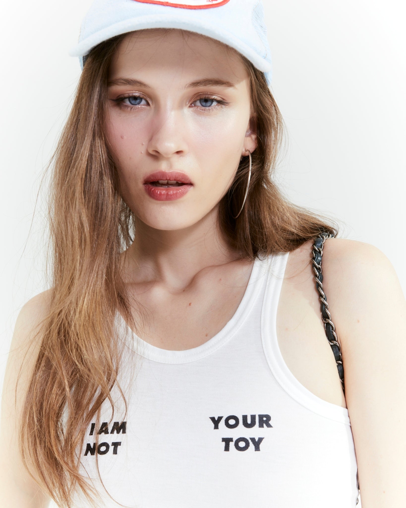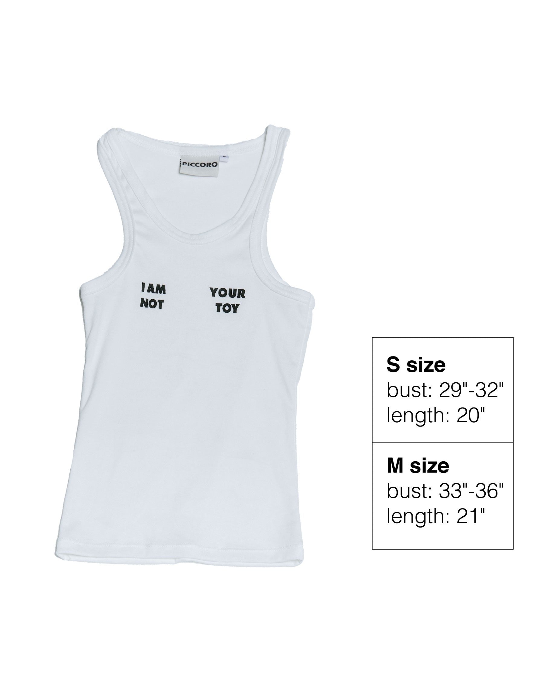 The I Am Not Your Toy Tank comes in white with a sassy front quote. Made from a soft cotton-spandex blend. Perfect for adding attitude to your everyday look.