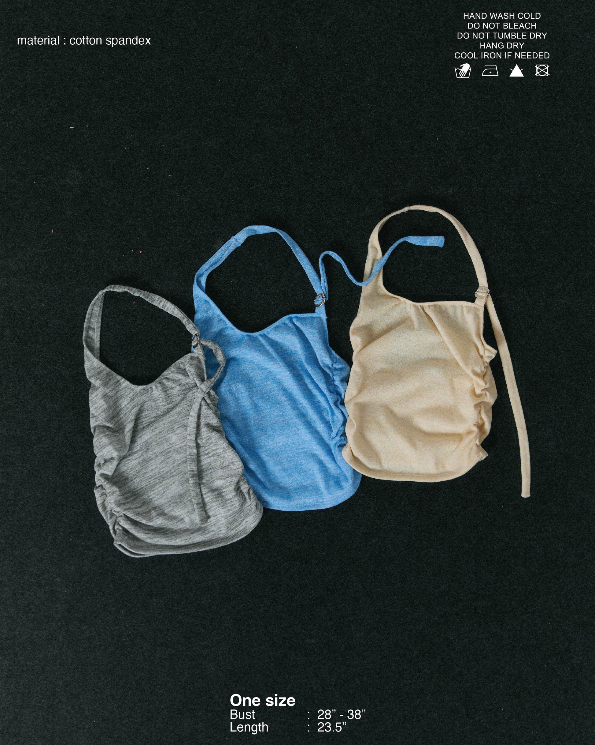 Made from cotton spandex fabric for comfy & cool touch with a quality logo lasered buckle. The Halter Top comes in 3 candy colors; butter, sky and fog -- easy to match with any bottom and giving sweet it-girl vibe.