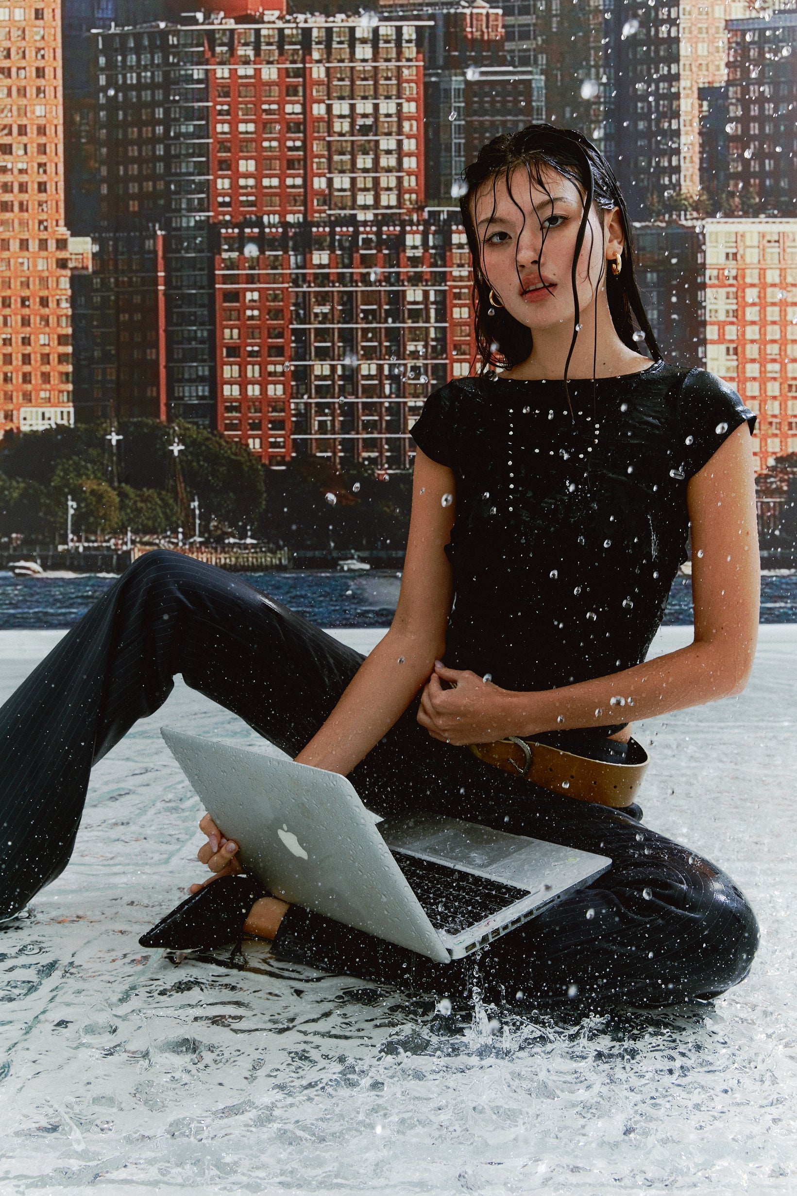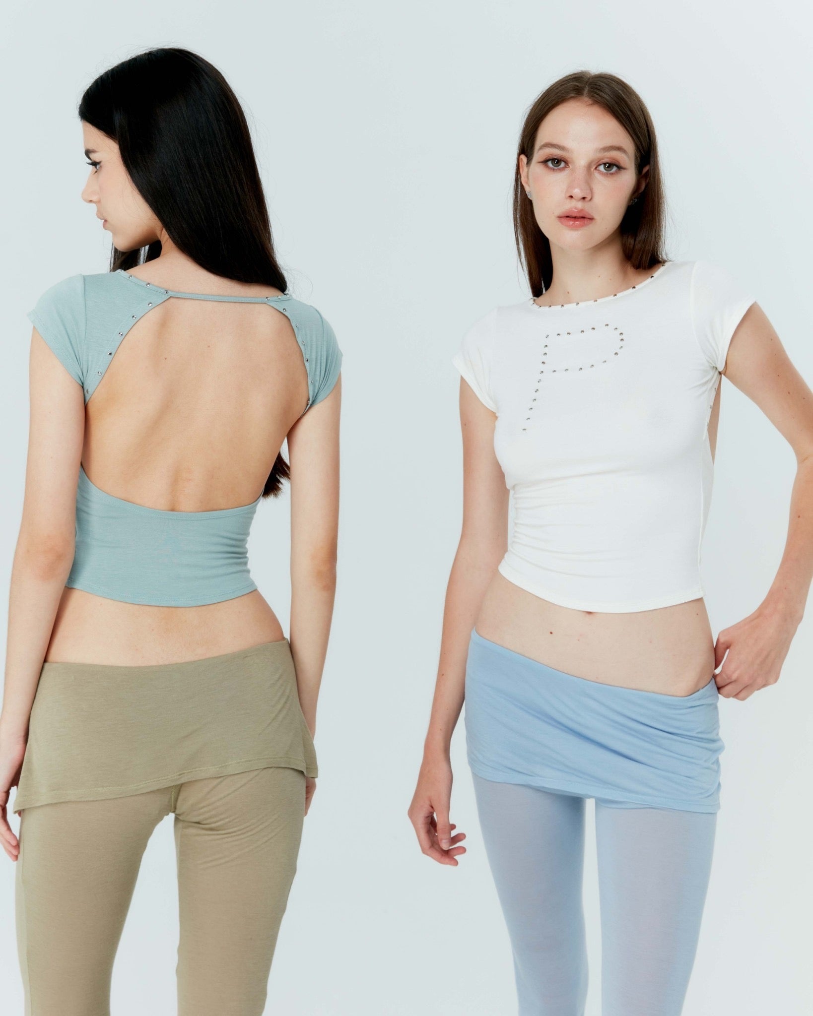 The Metal Studs Top is made from cotton spandex, with a free-size open-back design. Available in white, mint, brown, and black, it features stud details at the front.