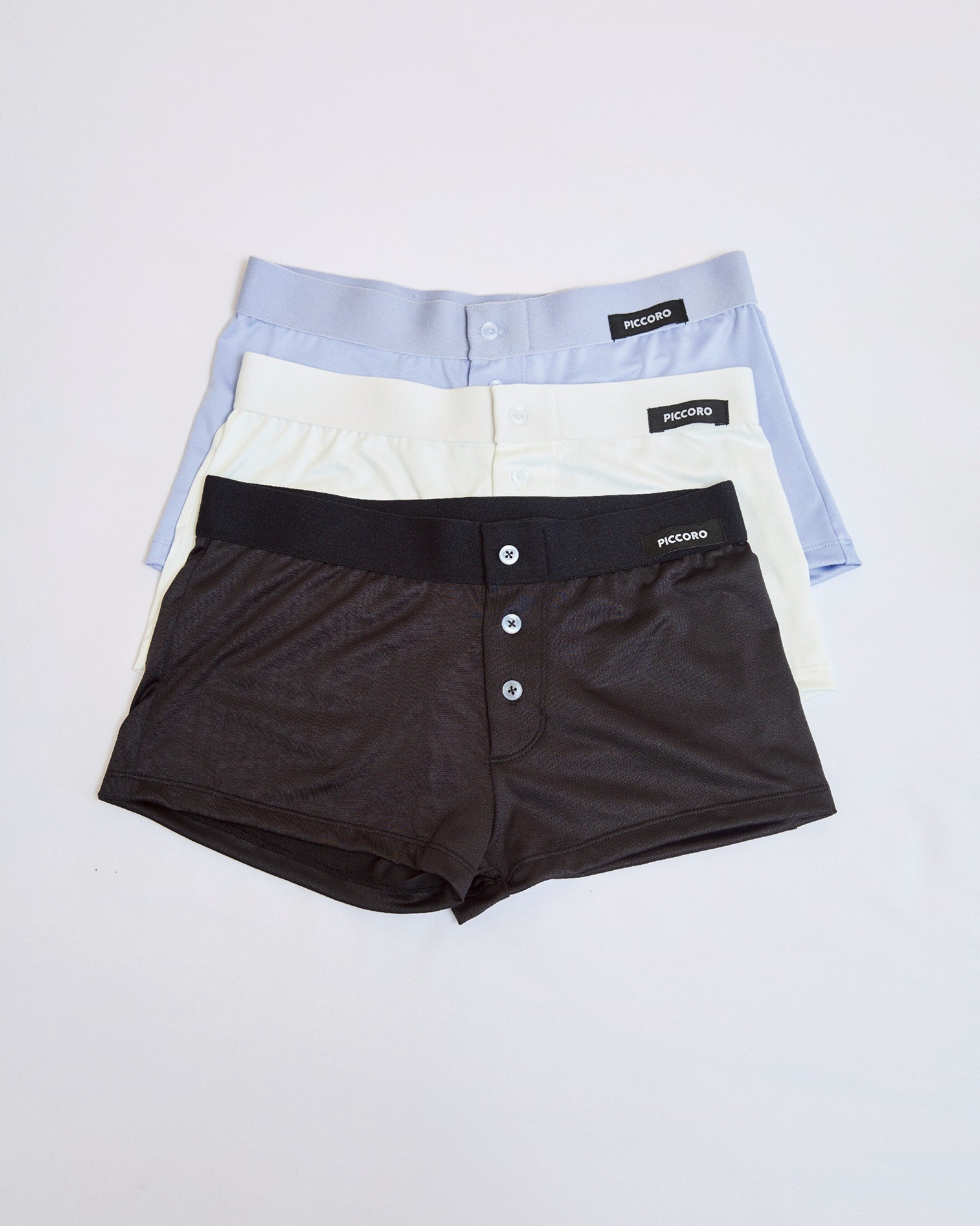 Made from Cotton Spandex with a cool-touch finish, these short panties stretch comfortably with your body. Smooth, breathable, and gentle on the skin, they fit snugly yet easily and are so comfy you’ll want to buy them again and again. Finished with a small PICCORO logo for a subtle, chic touch. Available in White, Baby Blue, and Black.