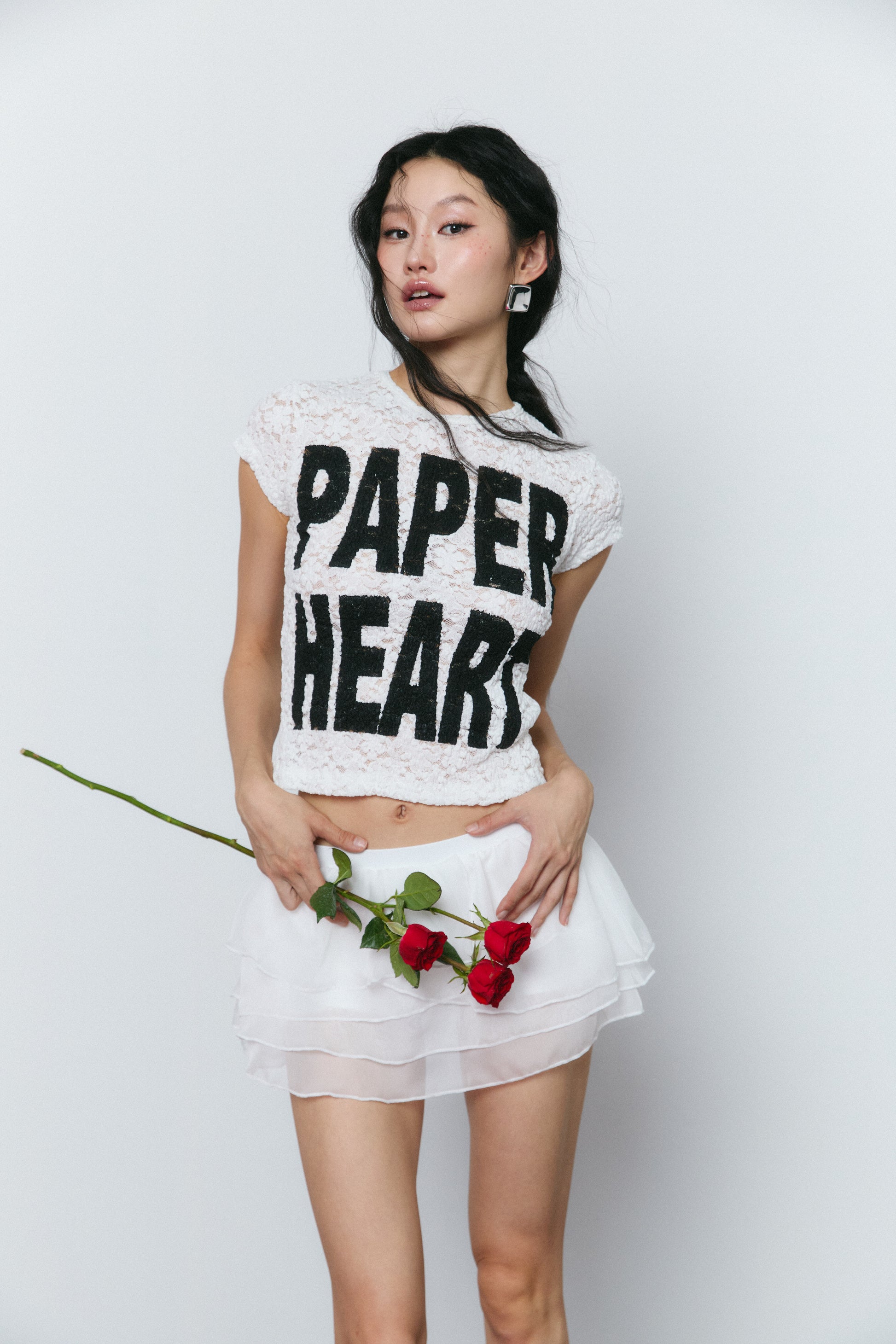 Paper Heart Lace Tee is crafted from soft, stretchy lace for a second-skin feel. Featuring a screen-printed ‘paper heart’ graphic at the front, this piece is perfect for layering or wearing solo.